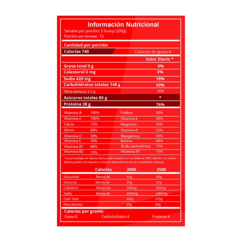 Mezcla 200 g en 500 ml de agua. Consume 1–2 veces al día tras entrenar o entre comidas para aumentar masa, energía sostenida y mejorar recuperación.