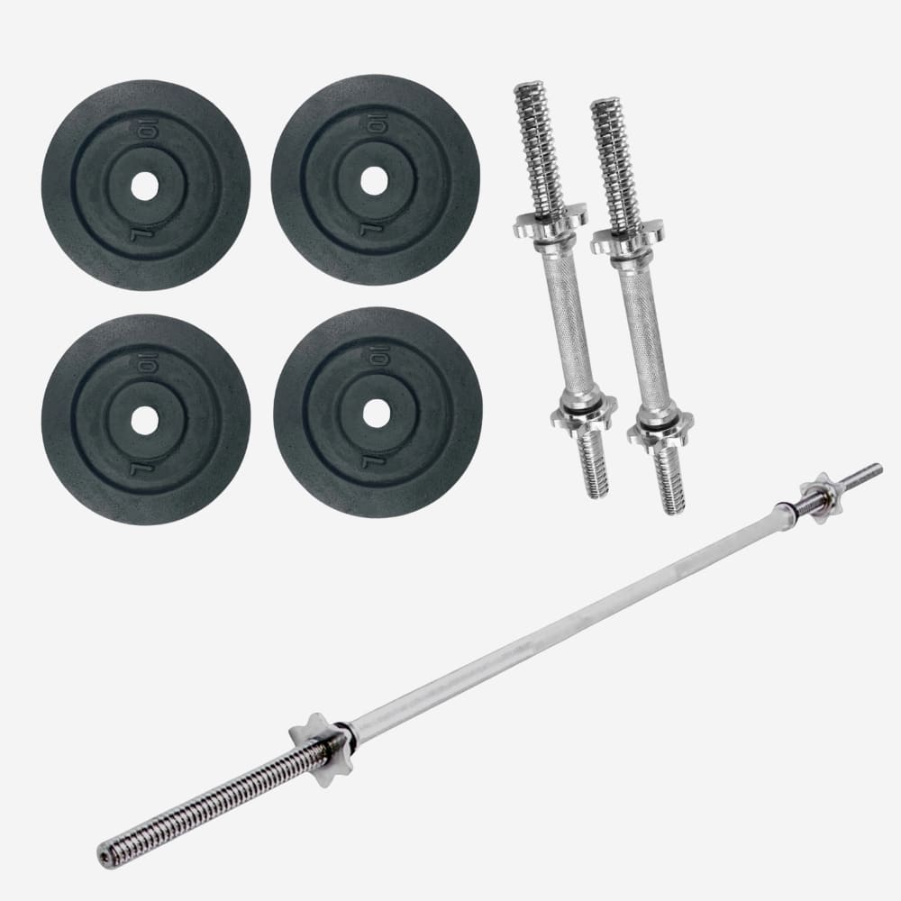 El Kit Full Body es un set de entrenamiento que incluye una barra de 1.20 m, dos mancuernas de 30 cm y cuatro discos de 10 lb en hierro fundido. Diseñado para trabajar todos los grupos musculares, ofrece resistencia, seguridad y versatilidad para entrenar fuerza desde casa o gimnasio.