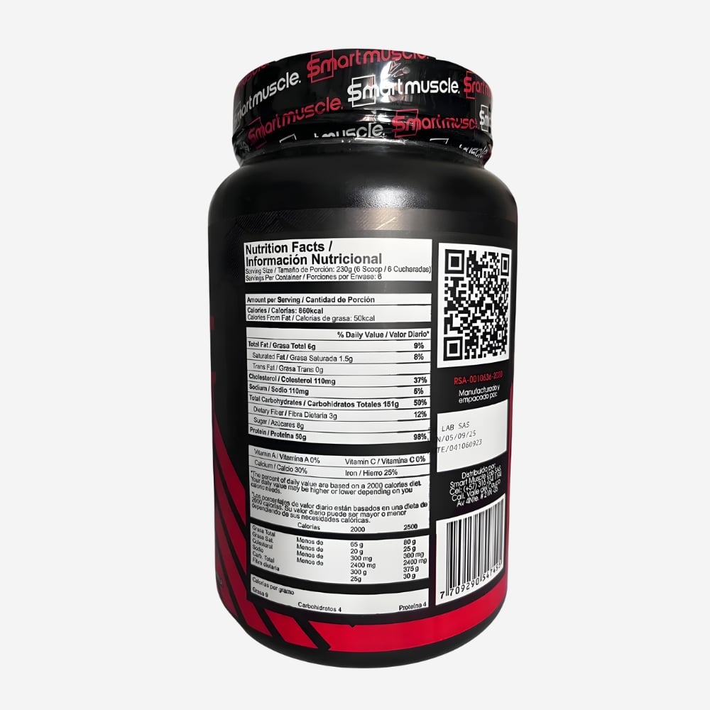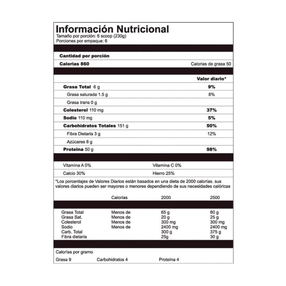 Mezcla 230 g en 650–700 ml de agua. Tómalo entre comidas o tras entrenar para aumentar masa muscular, energía sostenida y recuperación diaria.